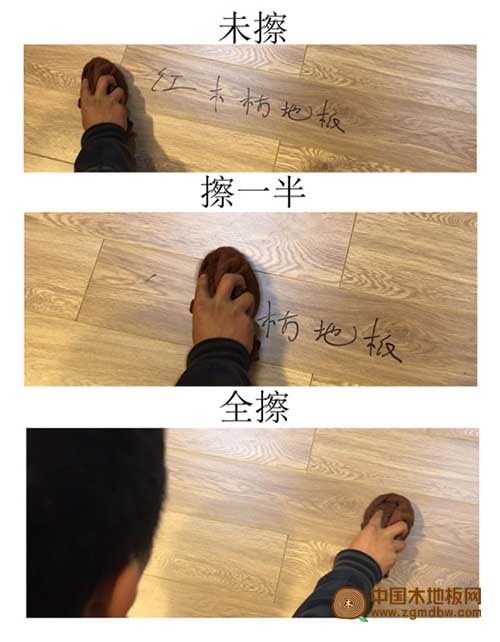 測試人員用黑色記號筆在地板上寫(xiě)上“紅木枋地板”的字樣,再用抹布輕輕擦拭,很輕松得就抹掉了黑色記號筆的痕跡,地板表面沒(méi)有留下任何痕跡。
