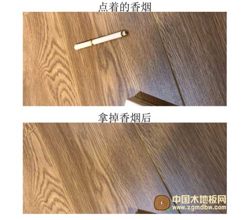 一根點(diǎn)燃的香煙,放在地板上三十秒鐘……時(shí)間到了之后,拿起香煙,地板表面沒(méi)有絲毫損壞。
