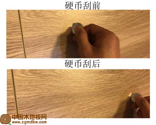 測試人員用一枚一元硬幣在地板上反復刮擦,無(wú)論輕重與否,地板表面沒(méi)有出現起皮、劃痕等現象,表面依舊如新,完美無(wú)瑕。經(jīng)測試可以發(fā)現,地板耐磨性可見(jiàn)一斑。
