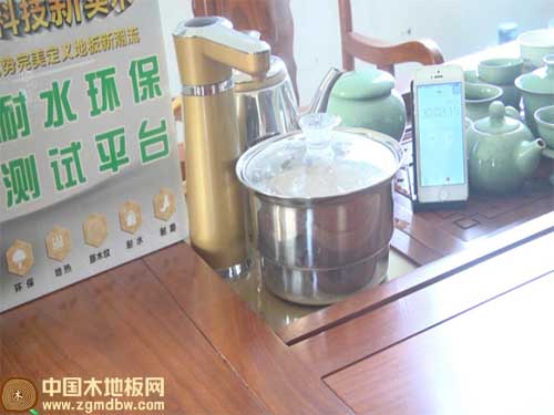 從照片中可以知道,地板已經(jīng)在沸水中煮上30分03秒15,那么30分鐘過(guò)去,地板究竟是否完好呢?