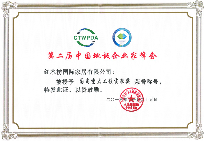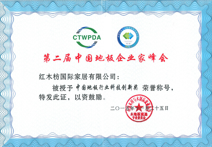 2015年11月25日,由中國木材與木制品流程協(xié)會(huì )主辦,主題為“審時(shí)度勢和衷共濟”第二屆中國地板企業(yè)家峰會(huì )在浙江湖州開(kāi)元名都大酒店隆重召開(kāi)。來(lái)自全國各地200余家優(yōu)秀企業(yè)家及業(yè)界專(zhuān)家代表出席本次會(huì )議。紅木枋地板作為行業(yè)新秀應邀參加本次高峰會(huì )議。并獲得“中國地板行業(yè)科技創(chuàng )新獎”和“國內重大工程貢獻獎”兩項殊榮。這是行業(yè)對紅木枋地板的最高禮遇,也是激勵紅木枋地板實(shí)現夢(mèng)想,不斷前進(jìn)的利器。